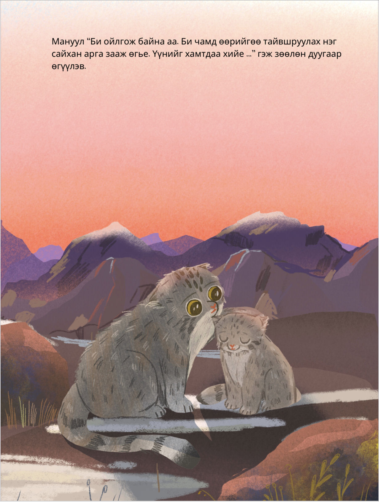 Le livre relate l’histoire d’un chat de Pallas ( chat sauvage de Mongolie et du Tibet : Manuul en mongol ) qui est dépressif.